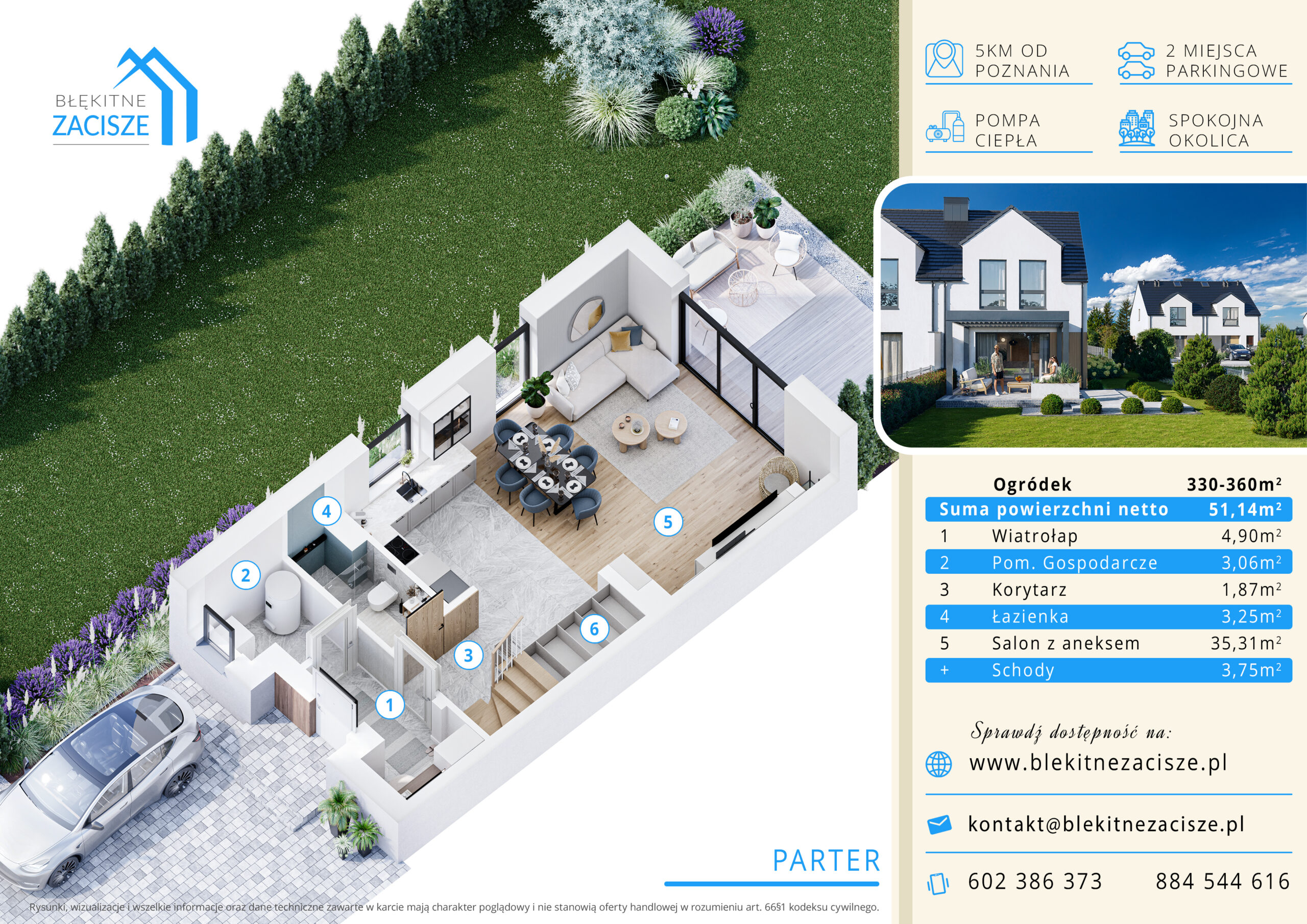 Inwestycja Błękitne Zacisze to idealne miejsce dla osób poszukujących harmonii między spokojnym, zielonym otoczeniem a bliskością miasta. Położona w malowniczej okolicy, inwestycja oferuje mieszkańcom codzienny kontakt z naturą, jednocześnie zapewniając szybki dostęp do kluczowych punktów usługowych, edukacyjnych i rekreacyjnych.